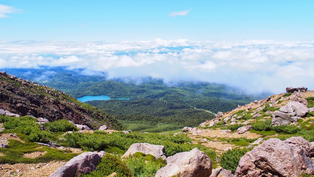 雌阿寒岳是個活火山,山頂下方接近噴發口處有個碧綠的火口湖,再遠處就是著名的阿寒富士。